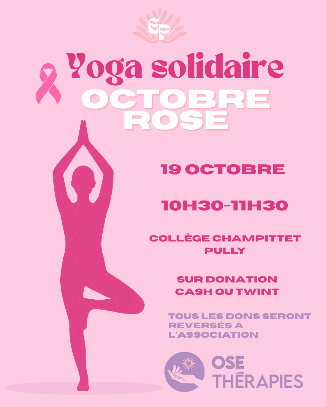 Rejoins-nous le 19 octobre de 10h30 à 11h30 à la salle de gymnastique du Collège Champittet à Pully pour une séance de yoga solidaire en soutien à la lutte contre le cancer du sein !